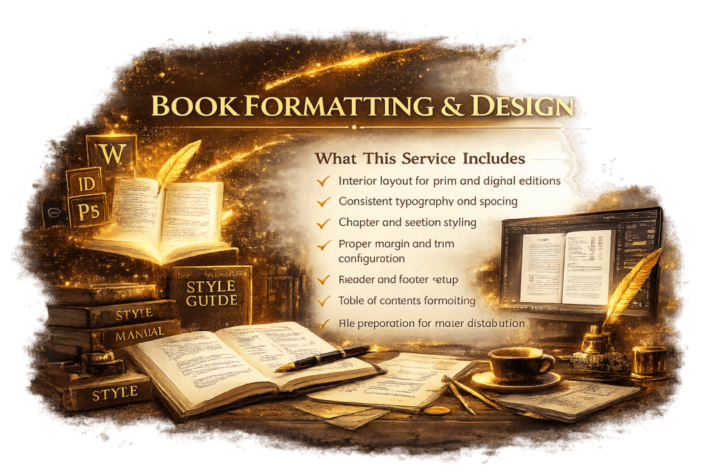 Well-formatted books create a stronger reading experience and help establish credibility with readers, reviewers, and retailers. Proper layout and design reduce production issues, support platform compatibility, and help ensure your book meets common publishing standards. Our goal is to help authors present their work with clarity, consistency, and professional polish.